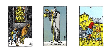 아 이거는 좀.... 솔직히 연애하기 힘든 배열이긴 합니다. 하필 은둔자까지 가운데 끼어서.... 질문자분에게 조금이라도 적극적으로 관심을 보이는 사람이 있다면, 마음이 가진 않더라도 한번 만나는 보세요(은둔자-6컵). 5펜타클은 가까운 곳에 도움의 손길이 있음을 나타내는 카드입니다. 의외로 이미 만났던 사람들 중에 있을 수도 있습니다. 올해는 이미 두달밖에 안남아서 어려울 듯 싶고... 내년에도... 4~6월정도는 돼야 가능성이 있어보입니다.